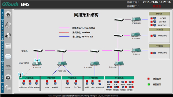 7)网络拓扑及通讯状态显示,直观的显示网络拓扑结构,显示通讯状态。