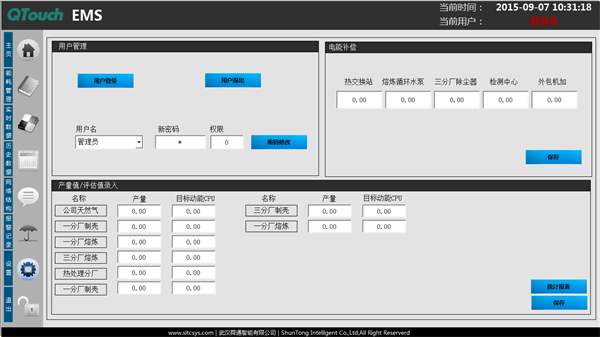 系统提供综合能耗/能效统计报表,采用菜单或光按钮直接引导界面模式,图形界面包括企业宏观的能耗数据和相关信息,快捷、直观反映企业、生产车间、班组和重要生产环节实时和历史能耗/能效信息。