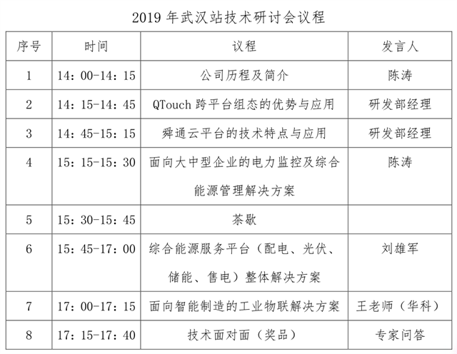 本次技术研讨会在如下几个方面希望和您展开深度合作和交流:QTouch跨平台组态的优势与应用、舜通云平台的技术特点与应用、面向大中型企业的电力监控及综合能源管理解决方案、综合能源服务平台(配电、光伏、储能、售电)整体解决方案、以及面向智能制造的工业物联解决方案等。
