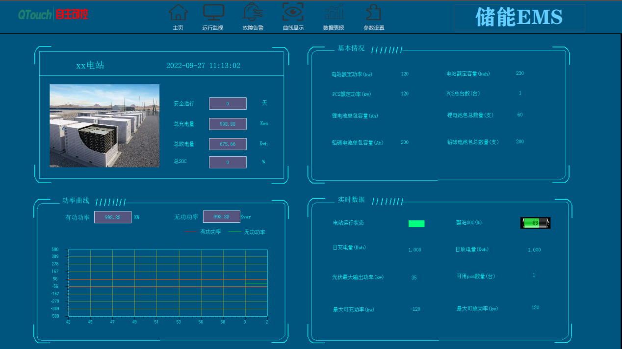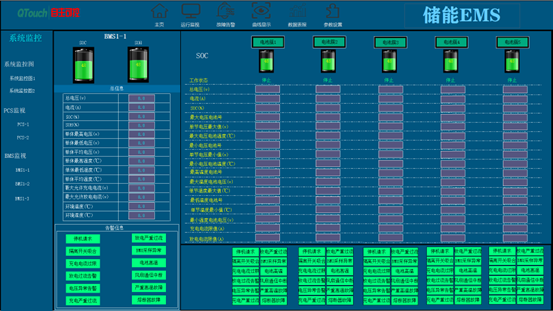 (1)储能EMS对储能电池的实时运行信息、报警信息进行全面的监视、并对储能进行多方面的统计和分析,通过可配置的接口,能够对储能系统按照设定的曲线自动控制,以及按照配置的参数自动保护,实现对储能的全方面掌控;