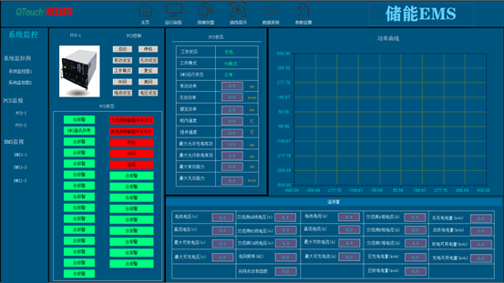储能EMS系统包含运行监测、故障告警、参数设置、数据报表、曲线显示以及能量管理等功能,主要监测信息包含:储能电池信息、电量信息、功率曲线、PCS 总充电量、PCS总放电量和负载有功功率。